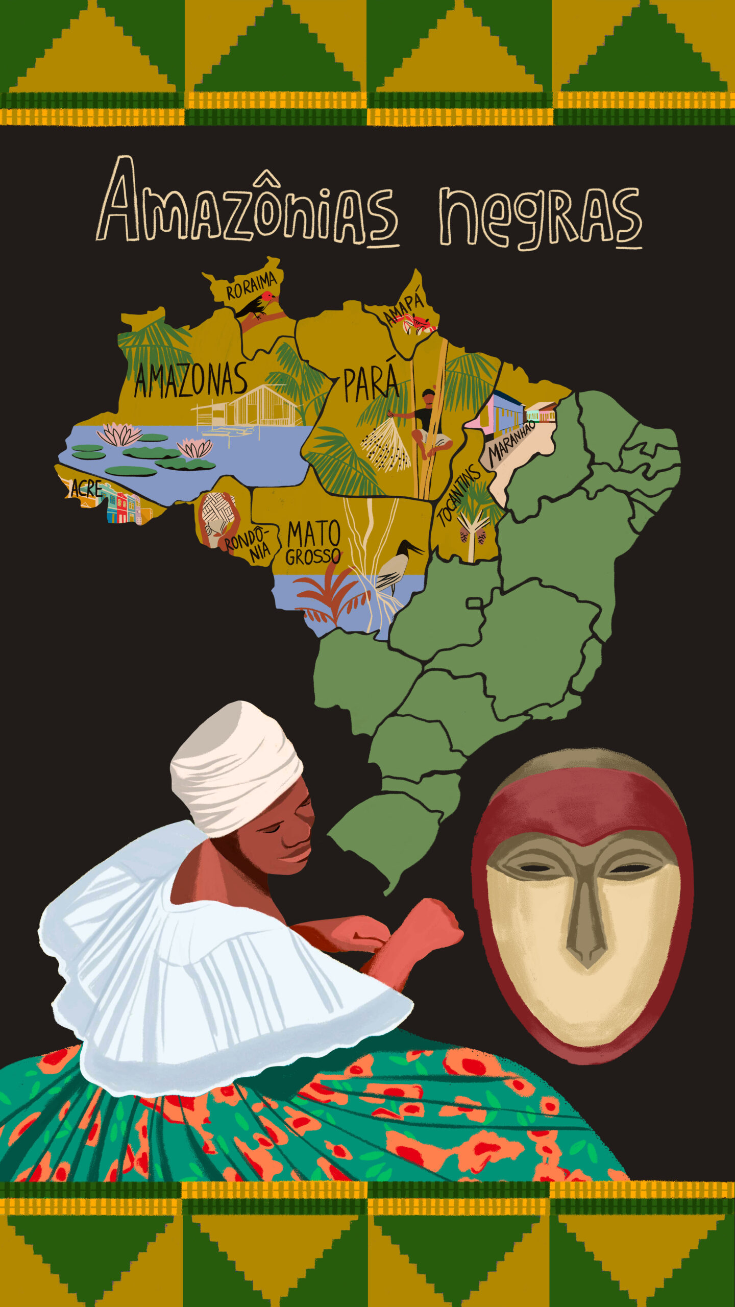 As ilustrações que compõem o vídeo também estão disponíveis para download gratuito em nossa galeria. Criadas por Carolina Sisla especialmente para o vídeo, elas podem ser usadas como fundo de tela ou em outros formatos que celebrem e compartilhem as Amazônias Negras.