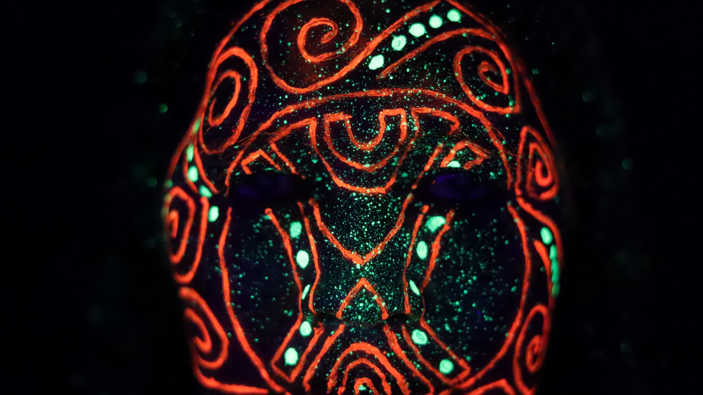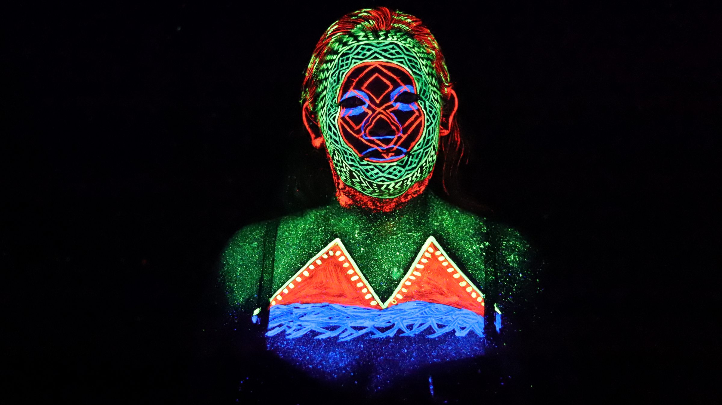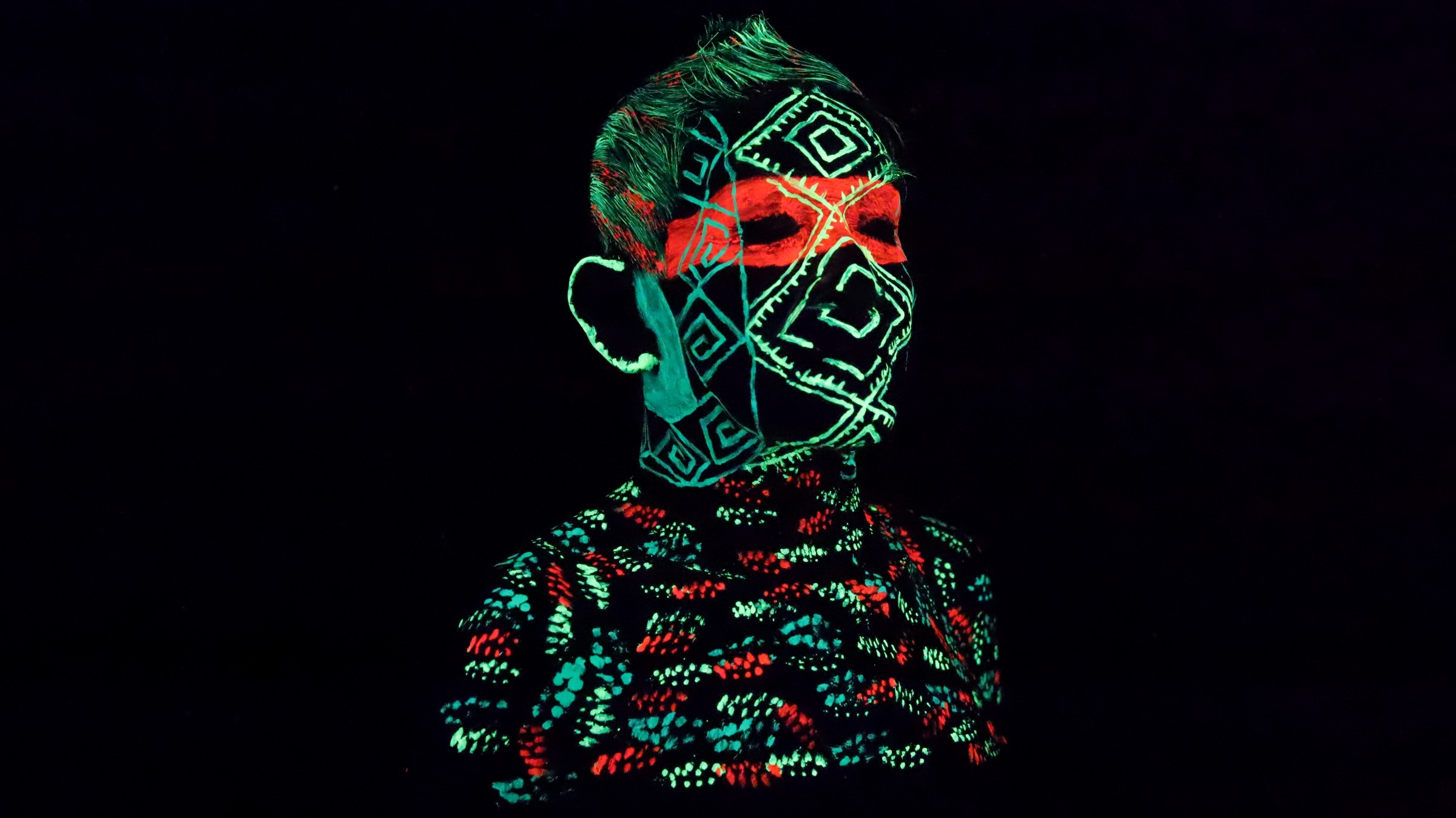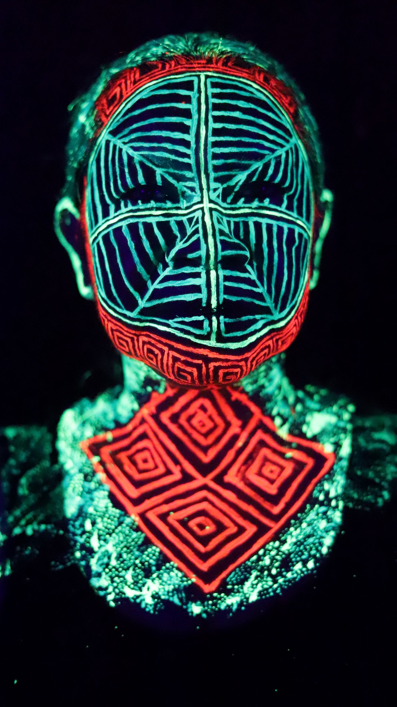 O momento de virada do artista aconteceu durante a pandemia, quando Paulo encontrou na fotografia com tinta luminescente uma possibilidade de linguagem. A partir daí, passou a desenvolver uma estética própria, na qual grafismos, corpos e luz se combinam para expressar a presença dos antepassados no presente.