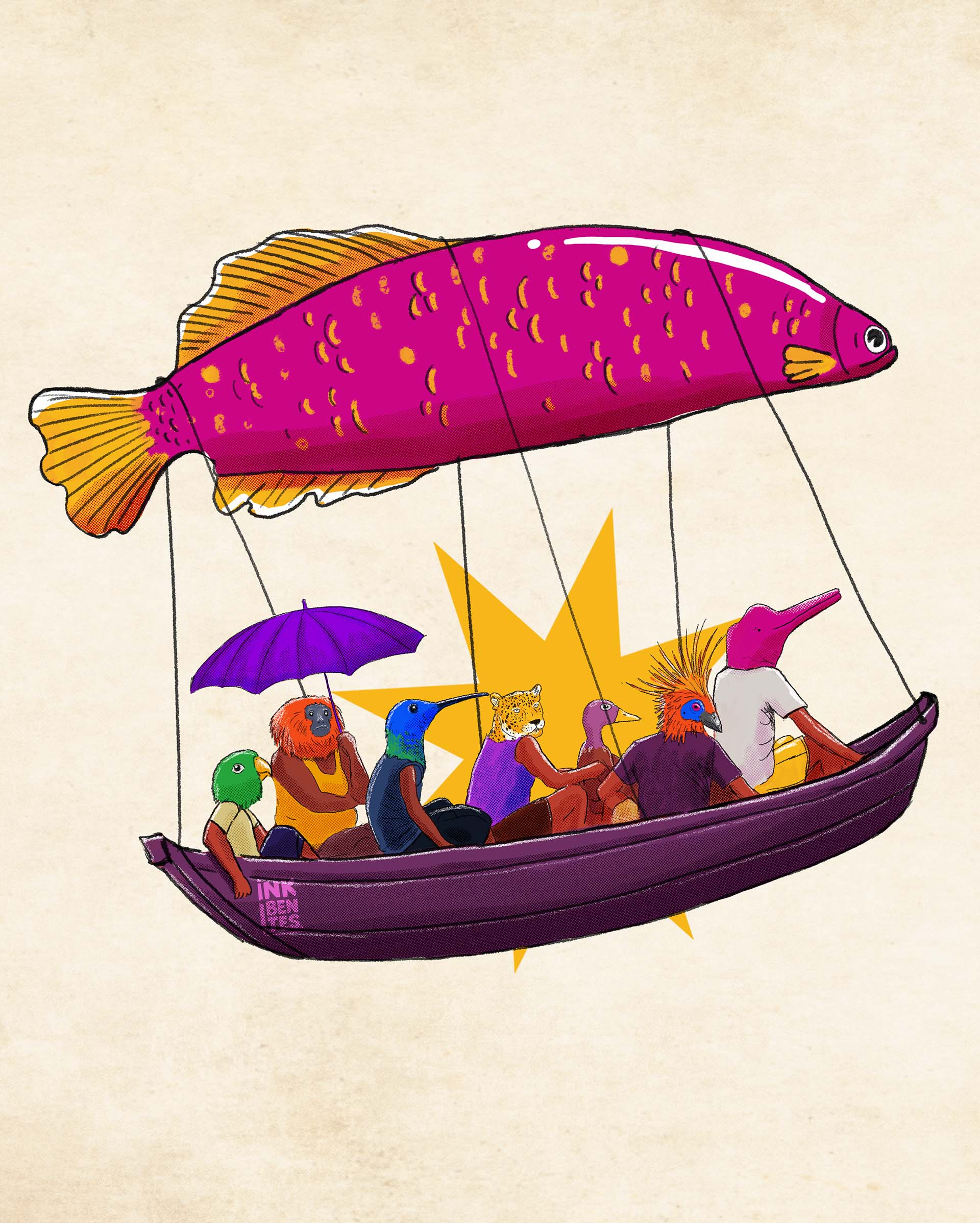 Para o Festival de Teatro da Amazônia, Yan criou uma visão fantástica: um pirarucu que se transforma em balão e carrega pessoas e animais de diferentes origens, como uma metáfora para a dimensão coletiva das culturas amazônicas. Misturando boto, galo-da-serra, periquito, mico-leão-dourado e outras figuras, a obra celebra a circulação cultural entre estados brasileiros e a presença de artistas de diversas regiões.