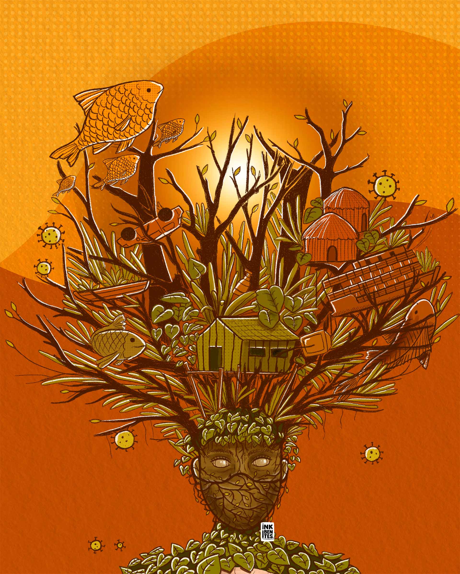 Já a obra Natureza e a Pandemia imagina um retorno da floresta enquanto as pessoas permaneciam em casa. A Mãe Natureza se expande sobre casas, canoas e objetos do cotidiano, como se retomasse o espaço interrompido pela rotina urbana. Tons terrosos e quentes reforçam o clima de calor amazônico, mesmo em meio ao silêncio das ruas. “Quis trazer essa perspectiva de como a natureza voltou a tomar conta de tudo por um tempo”, explica.