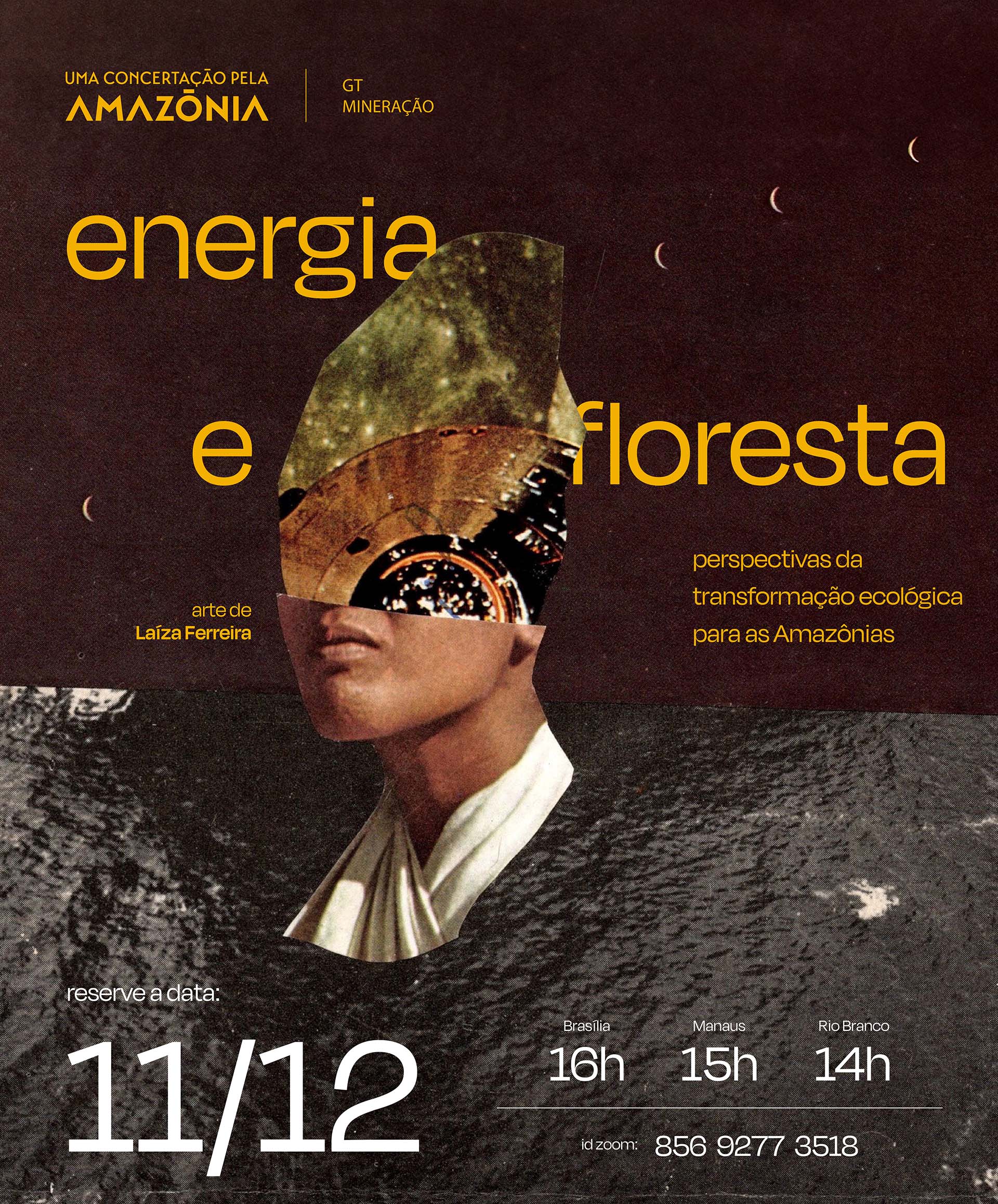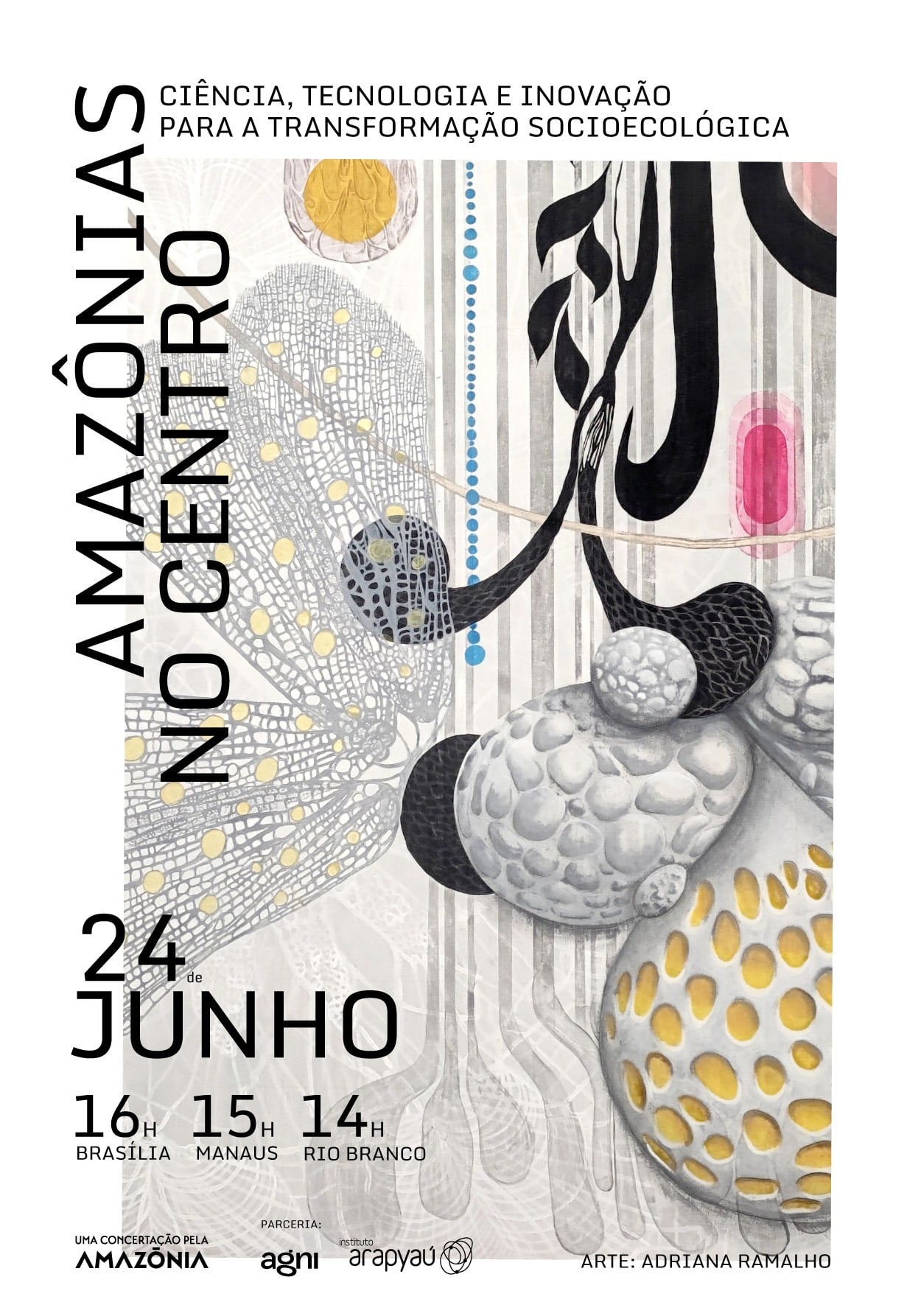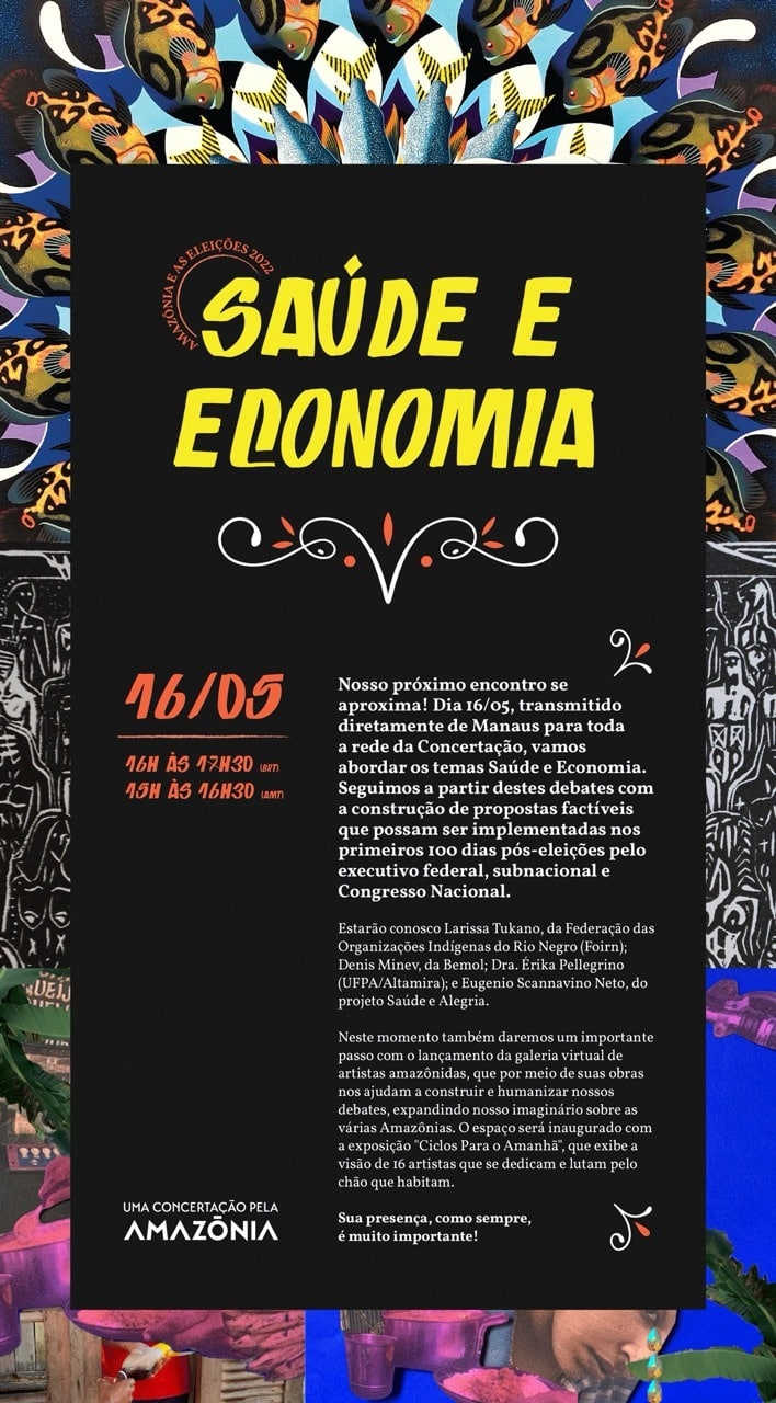 Um caos fundiário iluminado pelas linhas intensas de Uelinton Santana. Linhas delicadas de Hadna Abreu com aquarelas de micélios ressaltam a importância da educação, tema base para tudo e que muitas vezes é invisível como os fungos. Paula Sampaio com apenas duas cores imprime nas retinas consequências e registros de infraestruturas, outro tema central para uma agenda de desenvolvimento das Amazônias. Centrais também são a ciência, tecnologia e inovação na construção abstrata de Adriana Ramalho. Materialidade e imaterialidade aparecem nas colagens ancestrais e híbridas de Laiza Ferreira para compor um diálogo sobre floresta e energia. Energia que é uma grandeza escalar conjugada ao tempo e que também dá vida a manifestações culturais como o Cururu, retratado por Rai Reis.