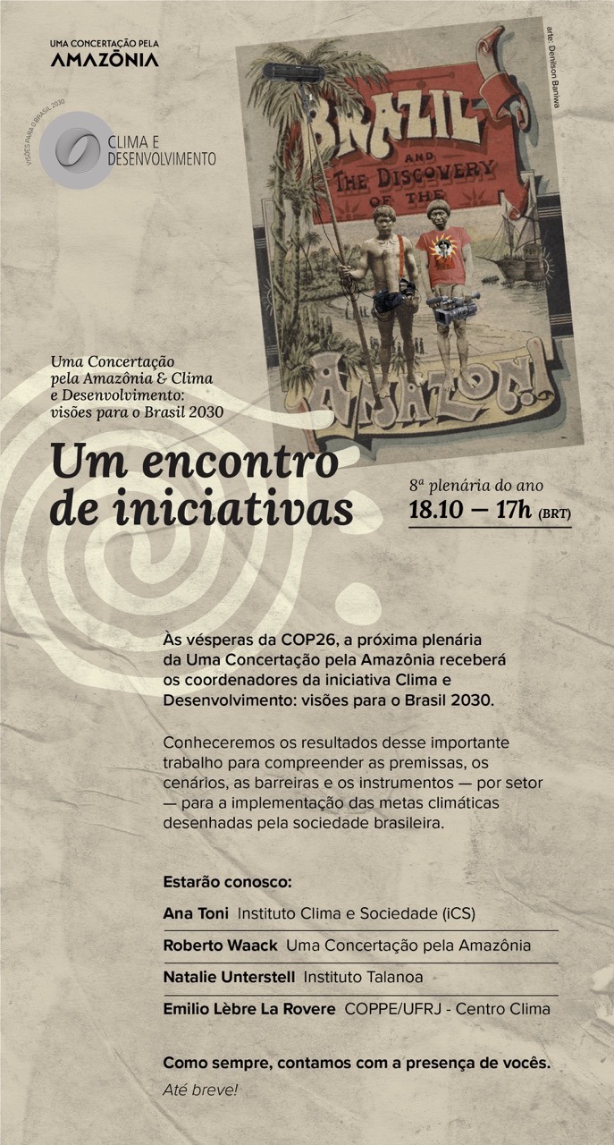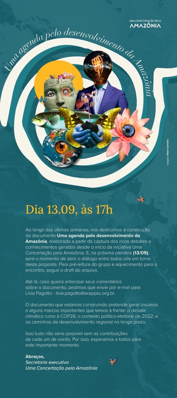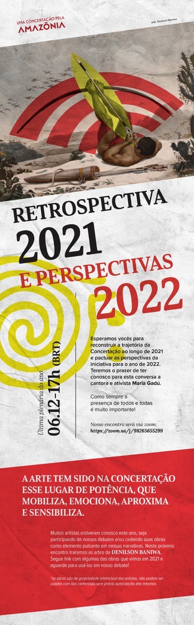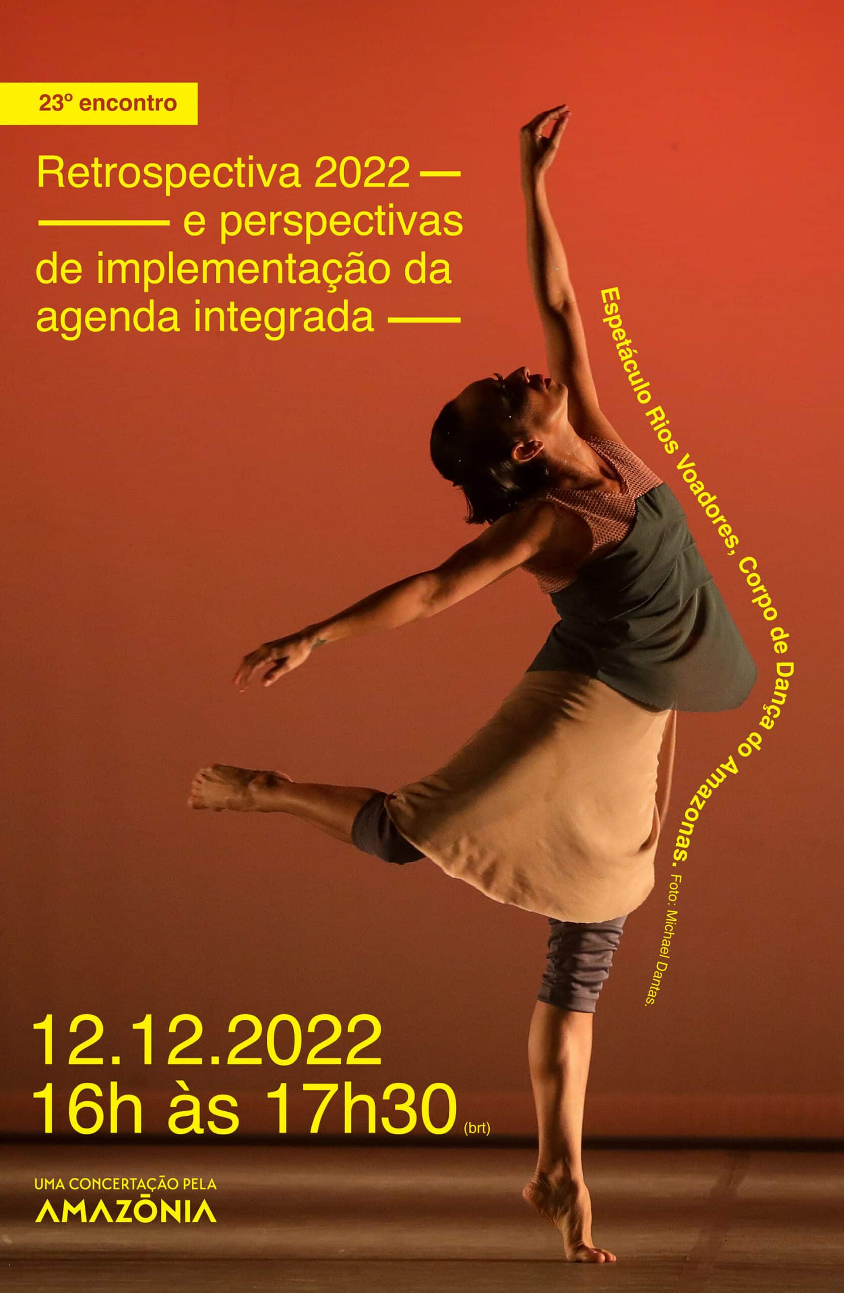 A espiral híbrida com colagens de Rakel Caminha trazem o dinamismo e a contemporaneidade de tempos sobrepostos. Encontros que nos ajudam a quebrar estereótipos, como as imagens de Denilson Baniwa: ora ressignificam personagens, ora apontam uma direção. Encontros nos quais a voz e a literatura de Julie Dorrico nos lembram que as Amazônias são muitas, são além do Brasil. Direção de eixos que se atravessam, que se influenciam, que conectam o tempo passado ao tempo futuro, suspenso pelos rios voadores da Companhia de Dança do Amazonas.