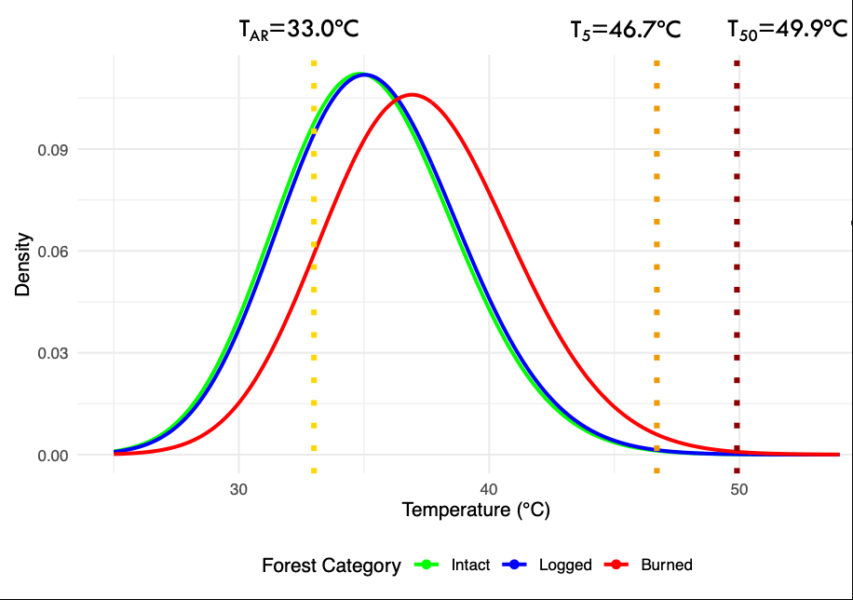 Florestas da Amazônia brasileira danificadas pelo fogo permanecem cerca de 2,6°C (4,7°F) mais quentes do que as florestas intactas ou exploradas seletivamente, e o calor extra pode persistir por pelo menos 30 anos.