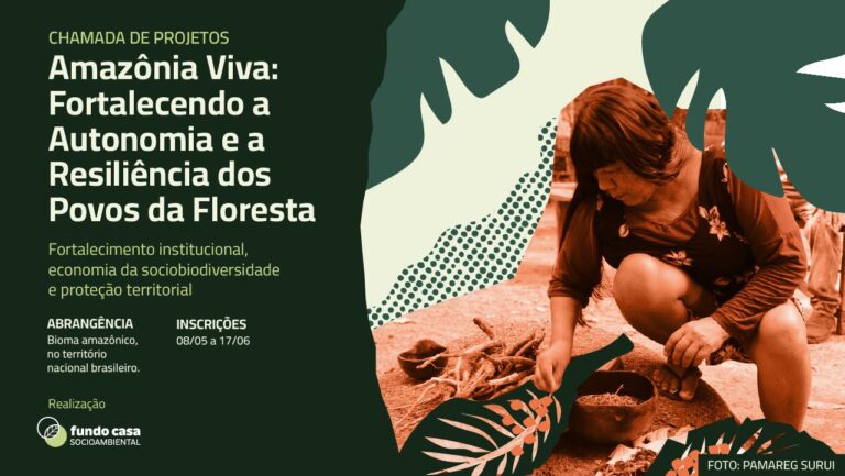 Com o objetivo de fortalecer iniciativas de populações locais e tradicionais da Amazônia brasileira, o Fundo Casa Socioambiental abre a segunda edição da chamada de projetos: Amazônia Viva – Fortalecendo a Autonomia e a Resiliência dos Povos da Floresta – Fortalecimento institucional, economia da sociobiodiversidade e proteção territorial. A primeira edição, realizada em 2024, apoiou os grupos com R$ 2,6 milhões.