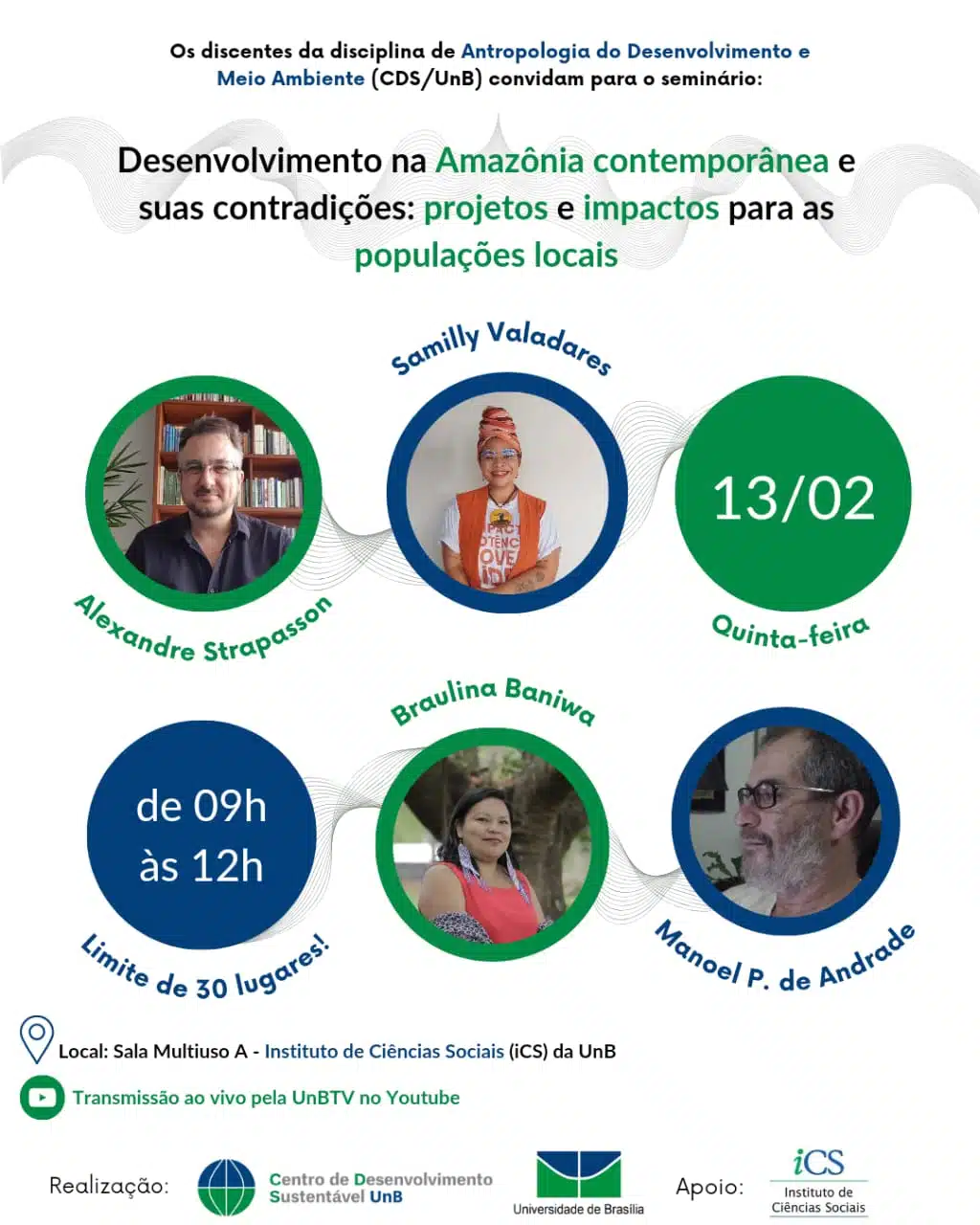 Os discentes da disciplina Antropologia do Desenvolvimento e Meio Ambiente, ministrada pela prof. Doris Sayago (PPGCDS), convidam você a participar do Seminário “Desenvolvimento na Amazônia contemporânea e suas contradições: projetos e impactos para as populações locais”. O evento reunirá quatro convidados: Alexandre Strapasson – Prof. do PPGCDS, especialista em mudanças climáticas; Braulina Baniwa – Doutoranda em Antropologia, militante e intelectual indígena; Manoel Pereira – Prof. da FAV, coordenador do Núcleo de Estudos Amazônicos (NEAz); Samily Valadares – Mestranda em Direitos Humanos, articuladora quilombola. O evento tem limite de 30 lugares no presencial (vagas ilimitadas no online!) e libras disponível.