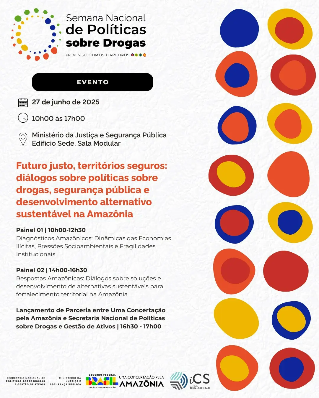A Secretaria Nacional de Políticas sobre Drogas e Gestão de Ativos do Ministério da Justiça e Segurança Pública (SENAD/MJSP), em parceria com Uma Concertação pela Amazônia e apoio do Instituto Clima e Sociedade, convida para o evento “Futuro justo, territórios seguros: diálogos sobre políticas sobre drogas, segurança pública e desenvolvimento alternativo sustentável na Amazônia”, que acontece no dia 27/06 , das 10h às 17h, no MJSP – Brasília. O evento vai discutir os impactos das economias ilícitas na Amazônia e caminhos para fortalecer os territórios com alternativas sustentáveis.