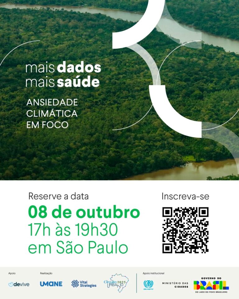 No dia 08 de outubro, às 17h, teremos o prazer de realizar, no Centro Brasileiro Britânico (São Paulo), o evento “Mais Dados Mais Saúde: Ansiedade Climática em Foco”, parte da programação do Circuito Urbano 2025, promovido pela ONU-Habitat em parceria com o Ministério das Cidades. Na ocasião, será lançado o inquérito Mais Dados Mais Saúde: Clima e Saúde na Amazônia Legal, uma iniciativa da Vital Strategies e da UMANE, com apoio do Instituto Devive, que ouviu moradores dos nove estados da Amazônia Legal sobre percepções e comportamentos relacionados a eventos climáticos, meio ambiente e poluição.