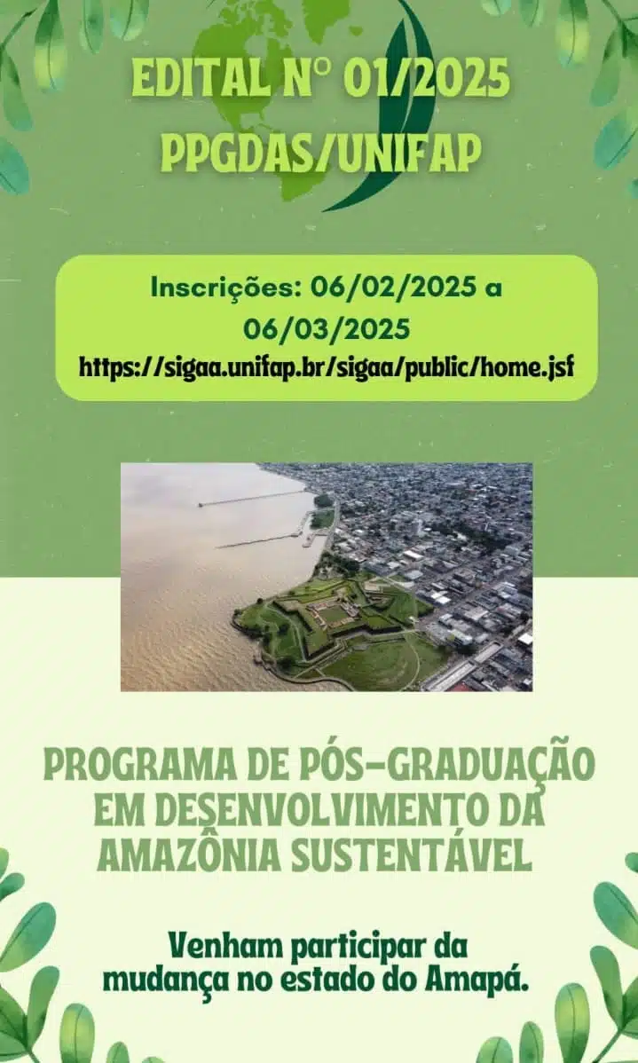 A Universidade Federal do Amapá (UNIFAP), por meio da Pró-reitora de Pesquisa e Pós-graduação (PROPESPG) e o Programa de Pós-Graduação em Desenvolvimento da Amazônia Sustentável da Universidade Federal do Amapá (PPGDAS/UNIFAP), torna público o Edital de Seleção para o Curso de Mestrado em Desenvolvimento da Amazônia Sustentável para a turma de 2025. Vagas em várias modalidades: Ações afirmativas, PCD, população tradicional, povos indígenas e ampla concorrência.